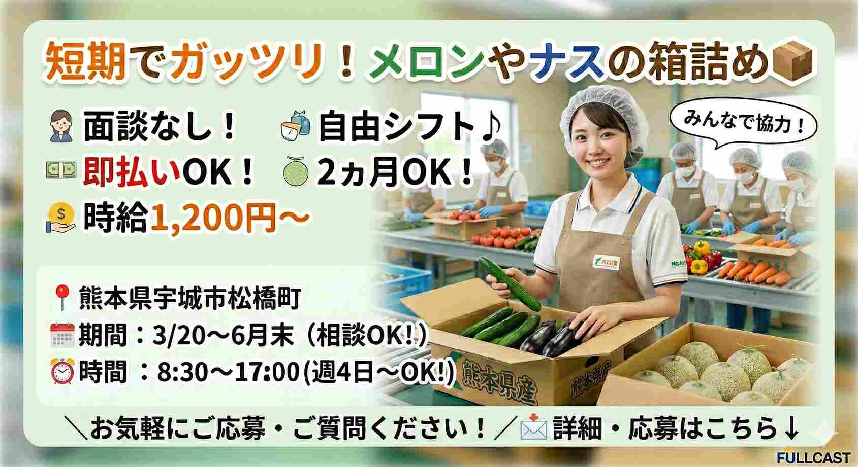 宇城市/青果物の陳列作業・梱包・接客/時給1250円♪