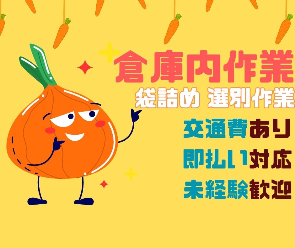 倉庫内作業(玉ねぎ、にんじん、いも類の袋詰めや玉ねぎの選別業務)