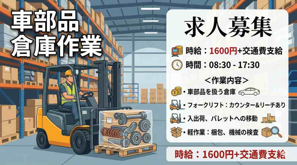 【時給1600円】車部品を扱う倉庫でフォーク+軽作業のお仕事!