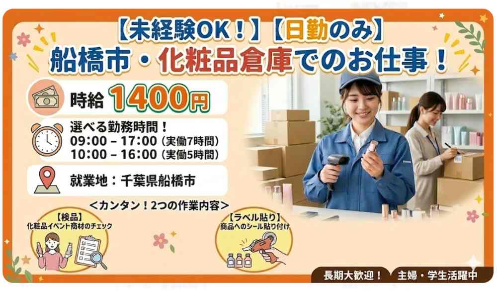 <週3~OK♪>船橋市で化粧品の倉庫内作業