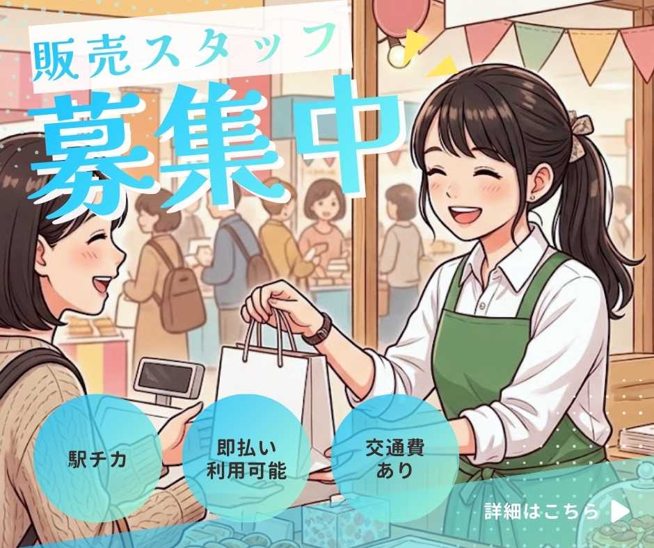 【時間】10:00~20:00 (平日)、10:00~21:00 (土日祝)の中で4~8時間勤務