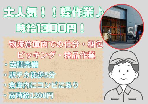 $今なら時給1300円!空調完備の倉庫での軽作業☆