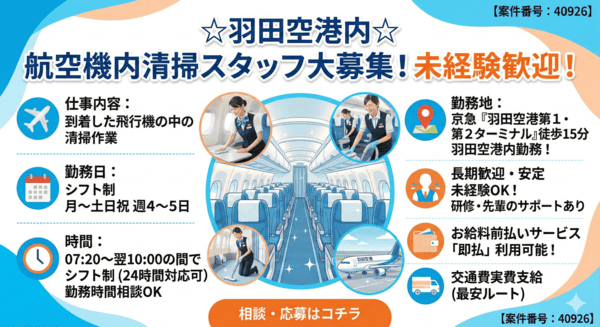 【時給1800円】航空機内清掃≪羽田空港第1・第2T駅≫