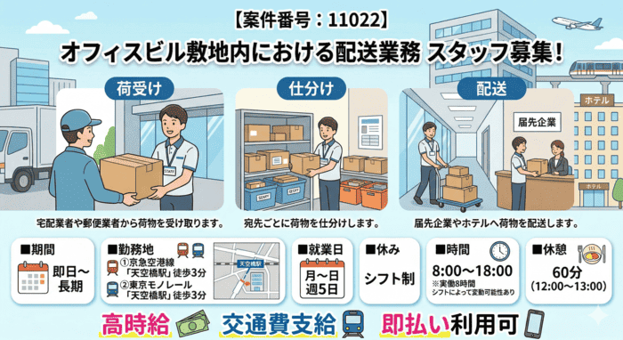 【時給1550円】オフィスビルの館内配送業務≪天空橋駅≫