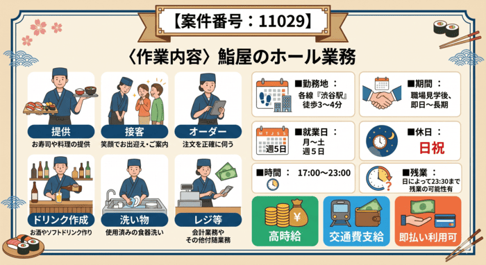 【時給1800円】鮨屋のホール業務≪渋谷駅≫