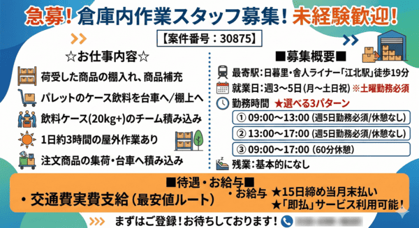 【時給1700円】簡単倉庫内作業≪足立区≫