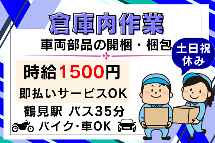 車両部品を扱う倉庫で、開梱・梱包作業スタッフを募集します。