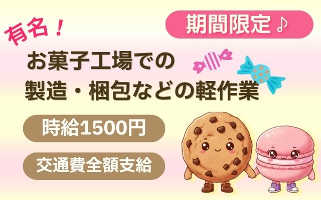 作業内容は食品工場内でのお菓子の製造・梱包などの軽作業です♪♪