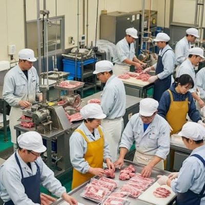 食品工場内で精肉の盛り付け、仕分け作業です。