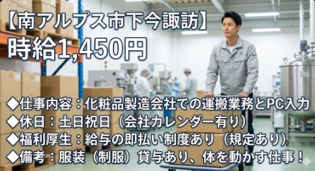 南アルプス【月24万】安定の土日祝休み!化粧品の運搬