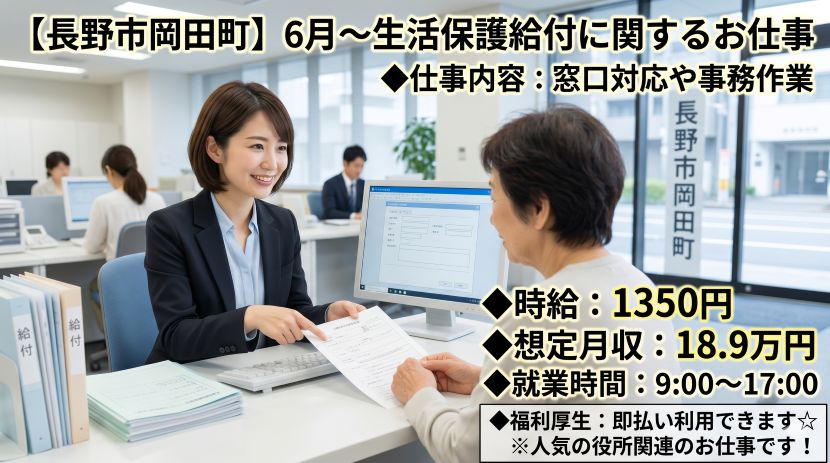 長野市:時給1350円6月~生活保護に関する窓口・事務