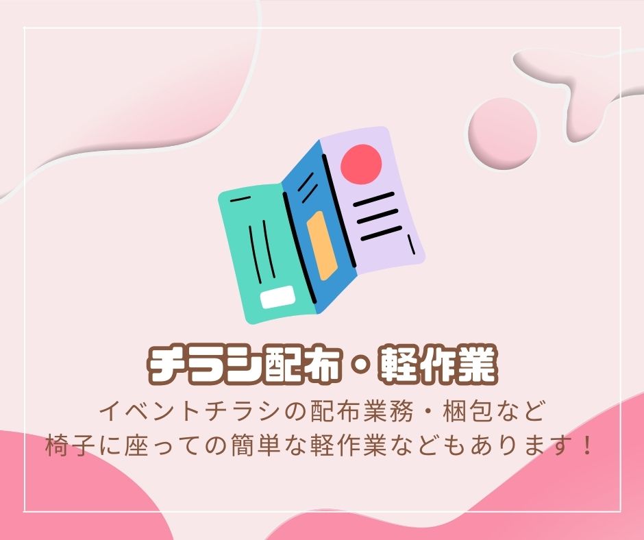 ⇒店舗入口及び開催場所付近にてイベントチラシの配布業務・梱包など椅子に座っての簡単な軽作業