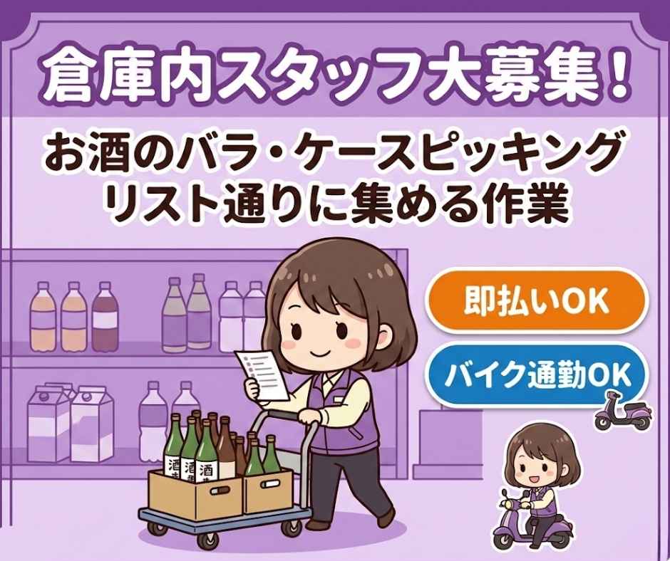 即払可【バイク・自転車可】時1200円♪お酒のピッキング作業♪