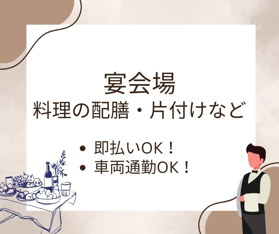 結婚式も行われる宴会会場での配膳・ドリンクの提供・片付けやテーブルの設置のお仕事です。