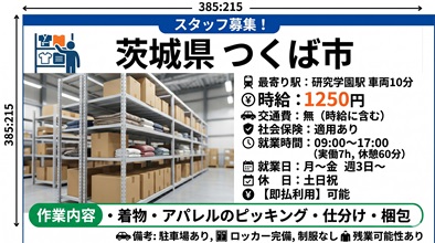 【時給1250円】つくば市稲岡 倉庫内作業