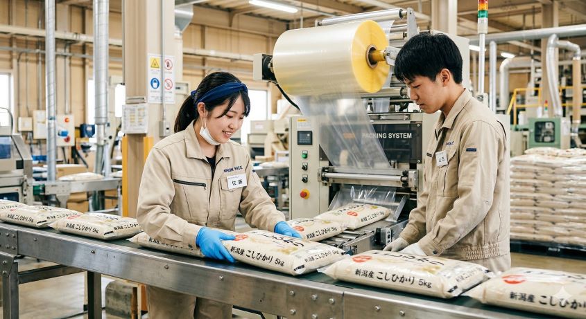 米袋のセットと出来上がったお米の検品作業