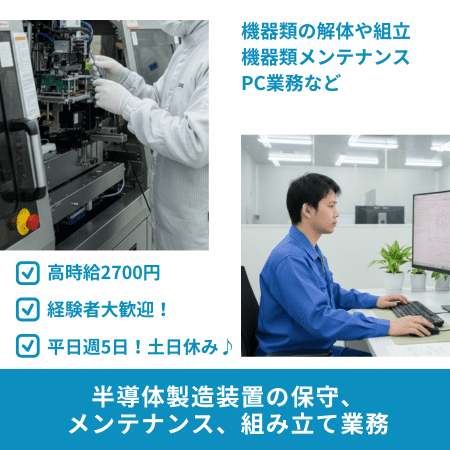 経験者歓迎!高時給♪保守、メンテナンス、組み立て業務