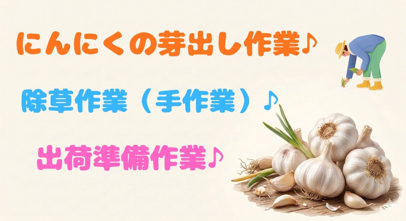 にんにくの芽出し作業・除草(手作業)・出荷準備のお仕事♪