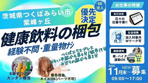 募SK【つくばみらい】栄養ドリンク梱包|時給1200円|即払い可