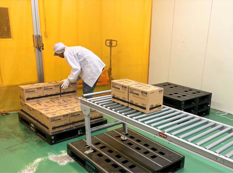 ペットボトルが入った段ボールをパレットに積むだけの簡単作業!
