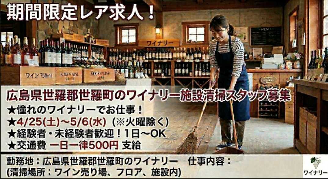 期間限定!らくらく!ワイナリー施設内の清掃業務!