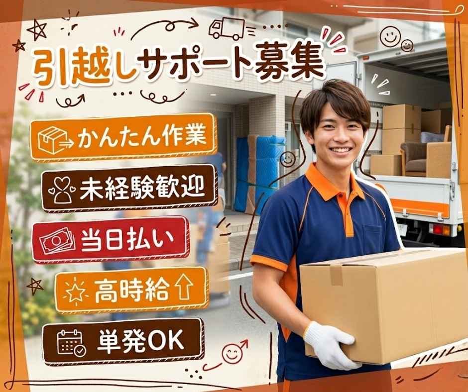 【業務内容】一般宅の引越作業【詳細】一般宅での家具・家電製品の搬入・搬出・開梱・片づけ作業など
