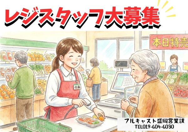 大館市内のスーパーでレジ業務にて就業していただきます。