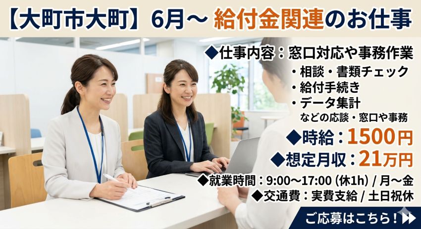 大町市:時給1500円6月~給付金に関する窓口・事務