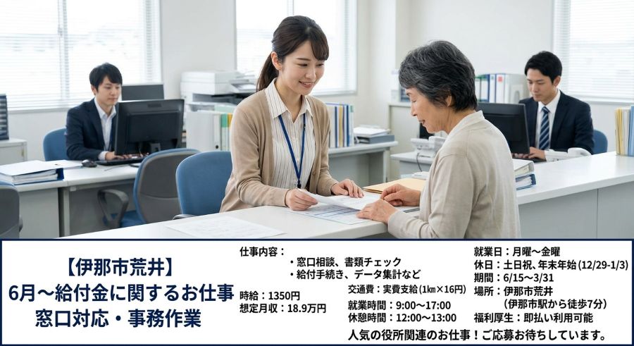 伊那:時給1350円6月~給付金に関する窓口・事務
