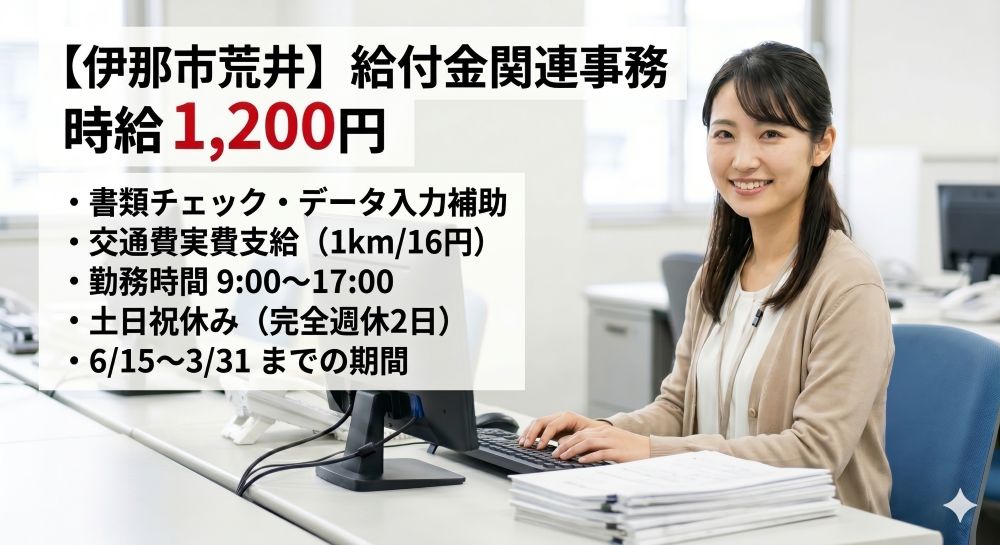伊那:時給1200円6月~給付金に関する事務業務