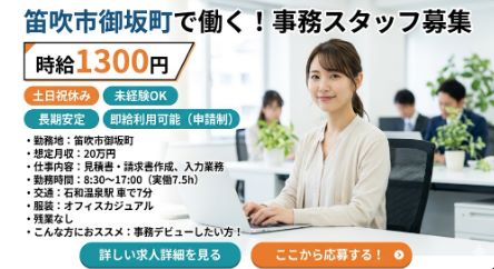 笛吹市【月20万】夕方17時まで!未経験歓迎の事務