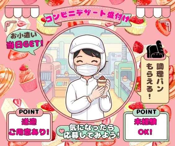 【検索ワード】#製造 #制服貸与 #即払 #未経験 #短時間 #ケーキ #デザート #車通勤