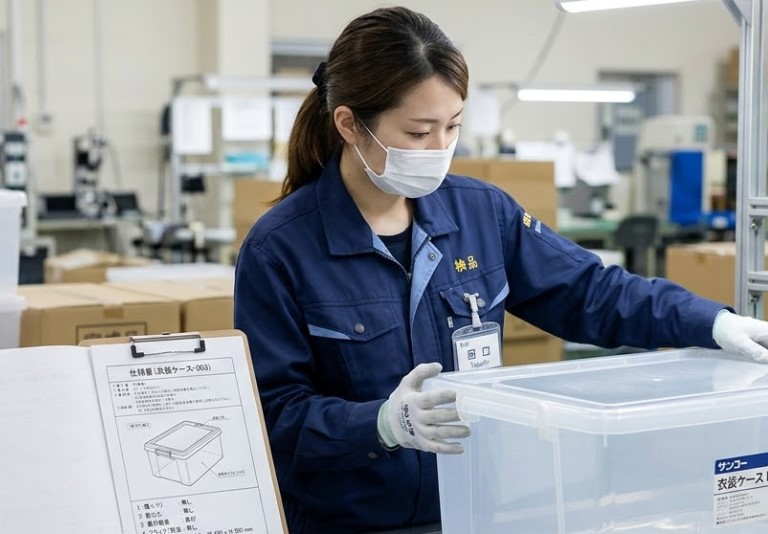 ■お仕事内容:機械から出てきたプラスチック製品(衣装ケース等)を仕様書にそって目視検品を行う。