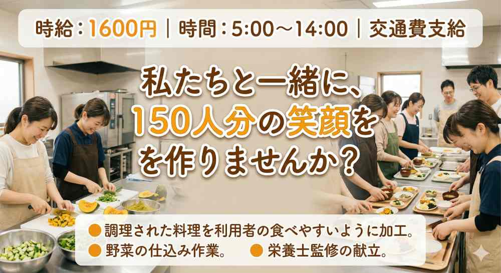 【時給1600円+交通費】介護施設での調理補助のお仕事♪