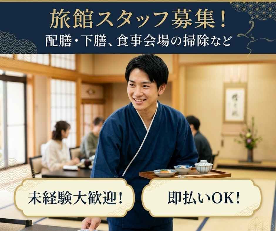 旅館での、配膳・下膳、食事会場の掃除、朝食準備をするお仕事