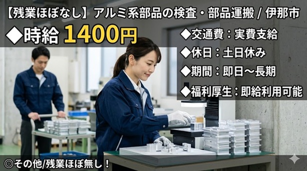 【残業ほぼなし】アルミ系部品の検査・部品運搬/伊那市