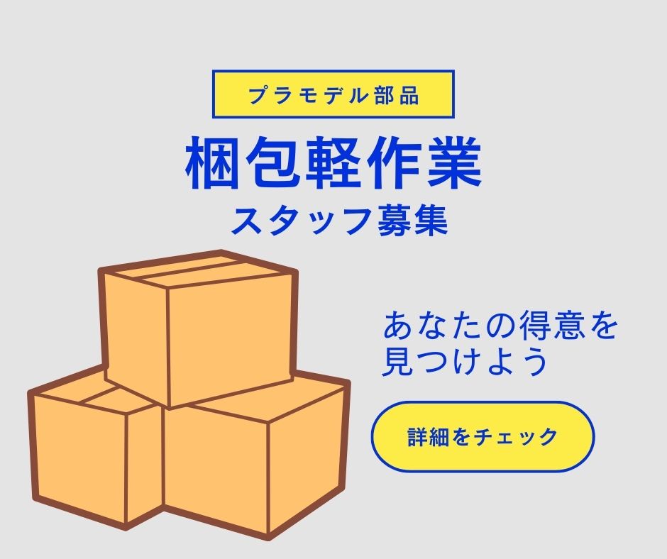 そんな有名アニメのプラモデルを扱うお仕事が入ってきました。 初心者でも簡単!プラモデルや雑貨の梱包等軽作業です。