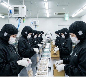 冷暖房完備のクリーンルーム内でスティックパウチ食品の包装・梱包作業