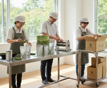 抹茶を所定の量で計量して、パックに袋詰め、シールを貼る作業です。