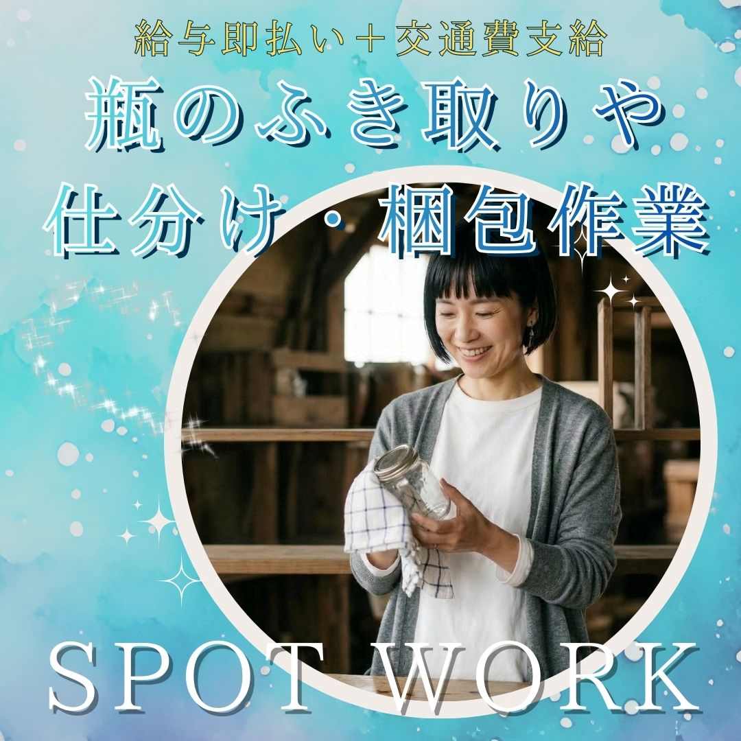 <給与即払い>瓶のふき取りと梱包・仕分け作業