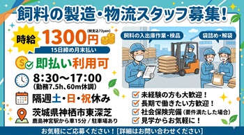 倉庫内で飼料の入出庫、商品管理(検品)、袋詰め・解袋作業をお任せしま...