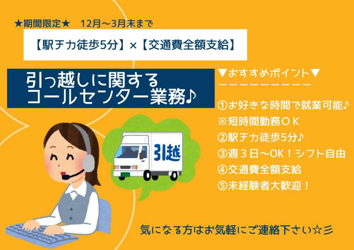引越業者のコールセンター♪/選べる時間帯!週3~OK!