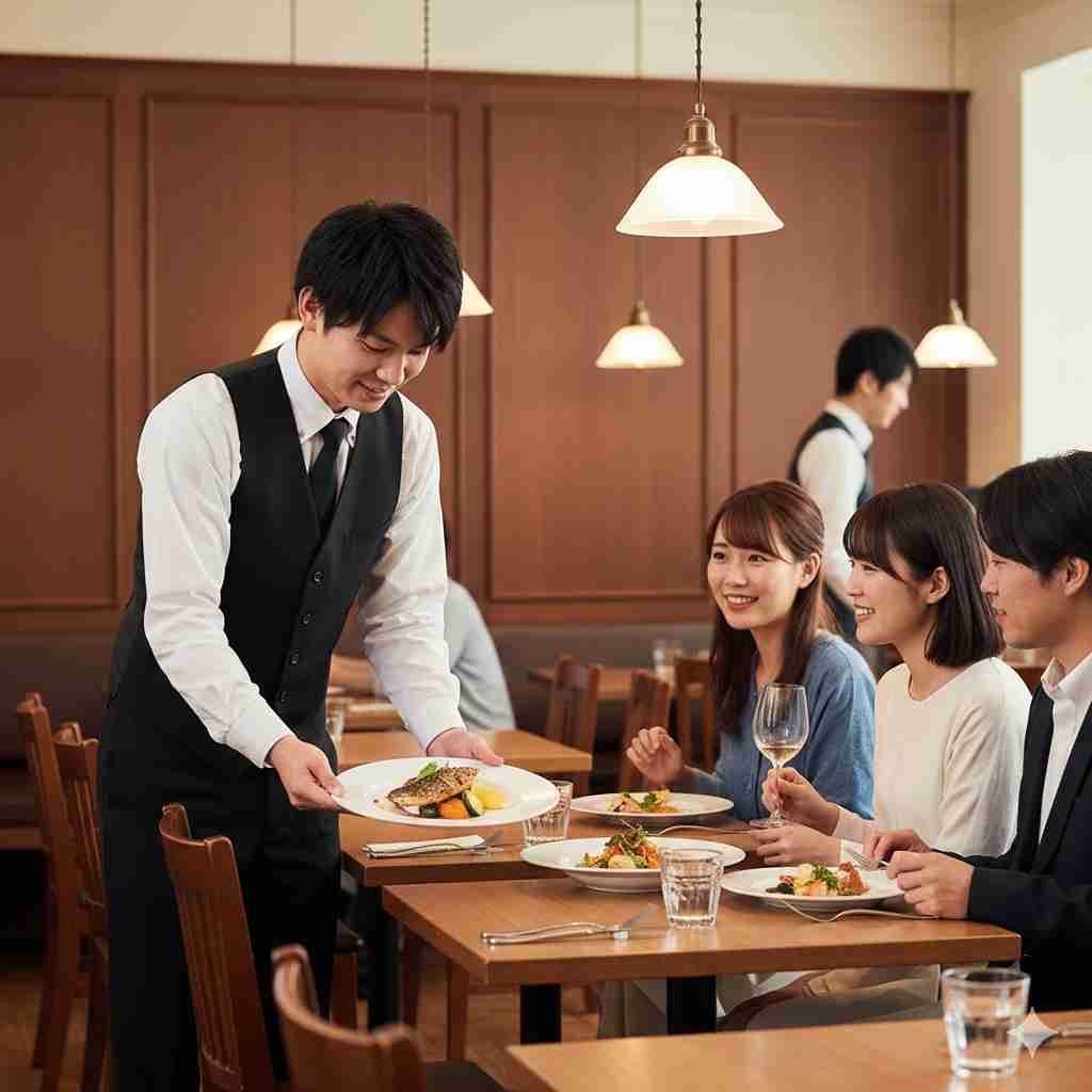 レストランで決められたお料理を運んだり、飲み物の注文を受けたりするお仕事になります。