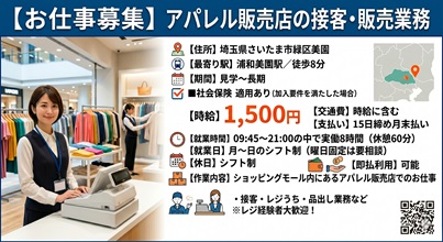 ~高時給1500円でしっかり稼げる!浦和美園駅徒歩8分のシニア向けブランドで、あなたの販売・接客スキルを活かしませんか?~