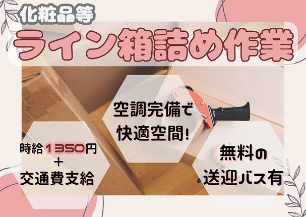 【無料送迎】コスメ箱詰め作業 // 時給1,350円+交通費