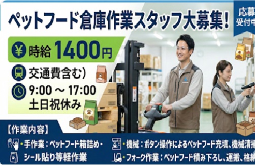 【駅チカ】時給1400円!週3~4日シフト/ペットフード取扱倉庫