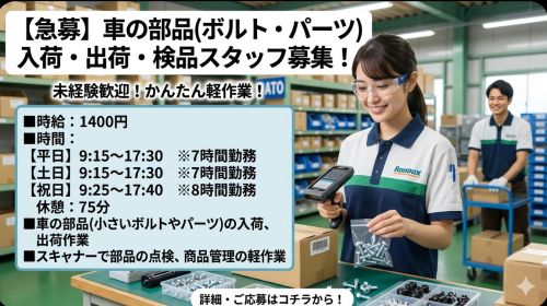 倉庫内で車に使用する車の小さいネジやボルトなどをスキャナーで読み取る作業です!