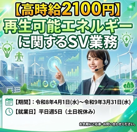 【高時給2100円】再生可能エネルギーに関するSV業務♪