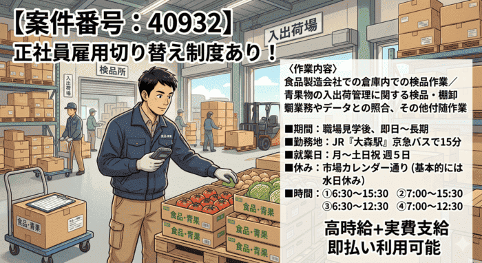 【時給1400円】食品製造会社での倉庫内検品作業≪大森駅≫