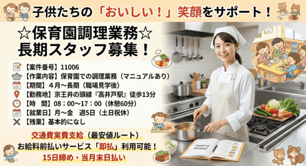 ・納得の高単価1800円! 調理のスキルをしっかり評価。17時にはお仕事終了&残業ほぼなしで、プライベートの時間もたっぷり確保できます。
